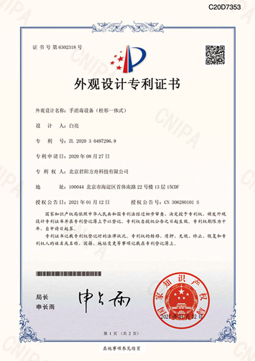 君阳方舟创新研发的户外型全天候一体式智能感应出液手消毒站专利产品,是重要的创新性公共卫生设施。