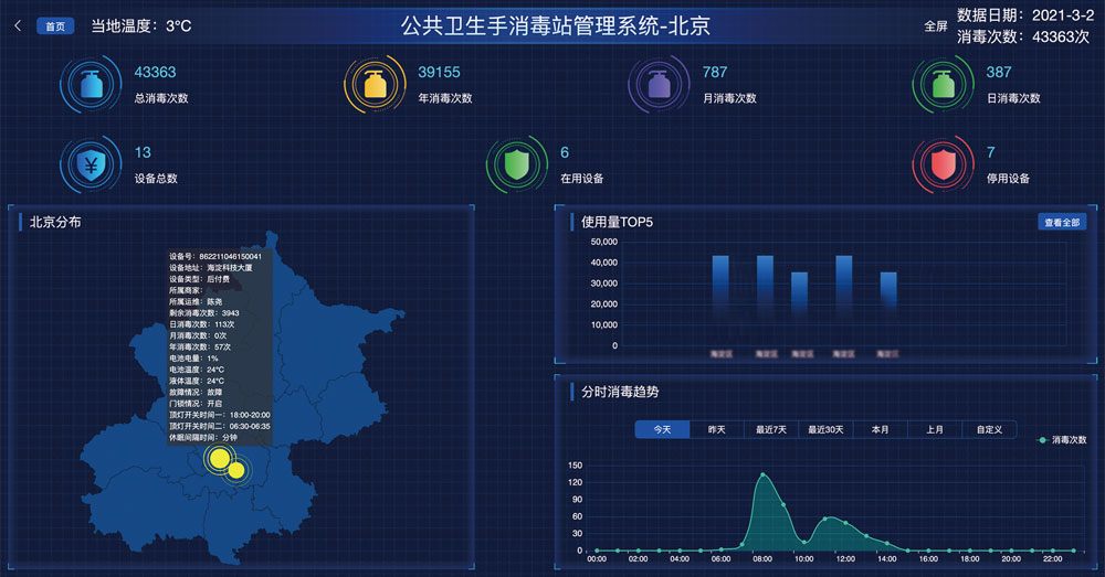 君阳方舟创新研发的公共卫生手消毒站点信息化管理系统可以实现站点运行状态的实时监测,实现站点运行与维护智能、精确、高效,并使其成为信息化、网络化、大数据化公共卫生管理系统中的一个智能节点,成为强大的公共卫生体系中的有机组成部分。